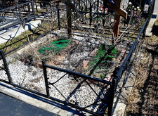 Ещё одна классическая уборка места захоронения. Отсыпанный крошкой участок замусорился, цветники поросли сорняком, металлическая оградка и кресты запылились.